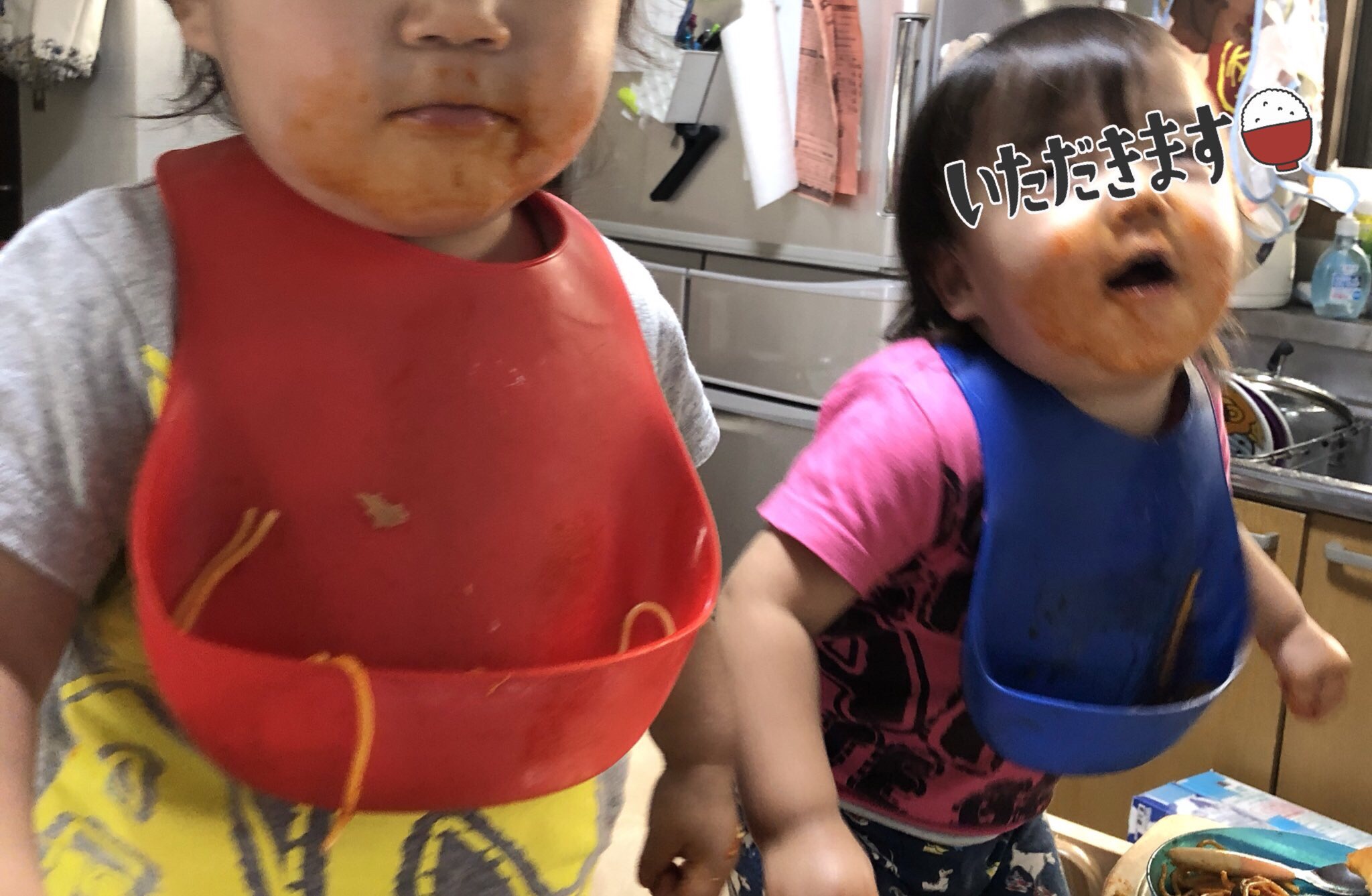 双子にトマトスパゲティを食べさせたら見事に袖のところを汚してくれました。