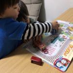 だれかな?カードはクイズ式になっています。パーシ―、ゴードン、ヒロは好きなので答えてくれました。次男が気に入って私の真似をするのですが、パーシ―のカードにだれかな?カードを重ねて私に満面の笑みで見せて