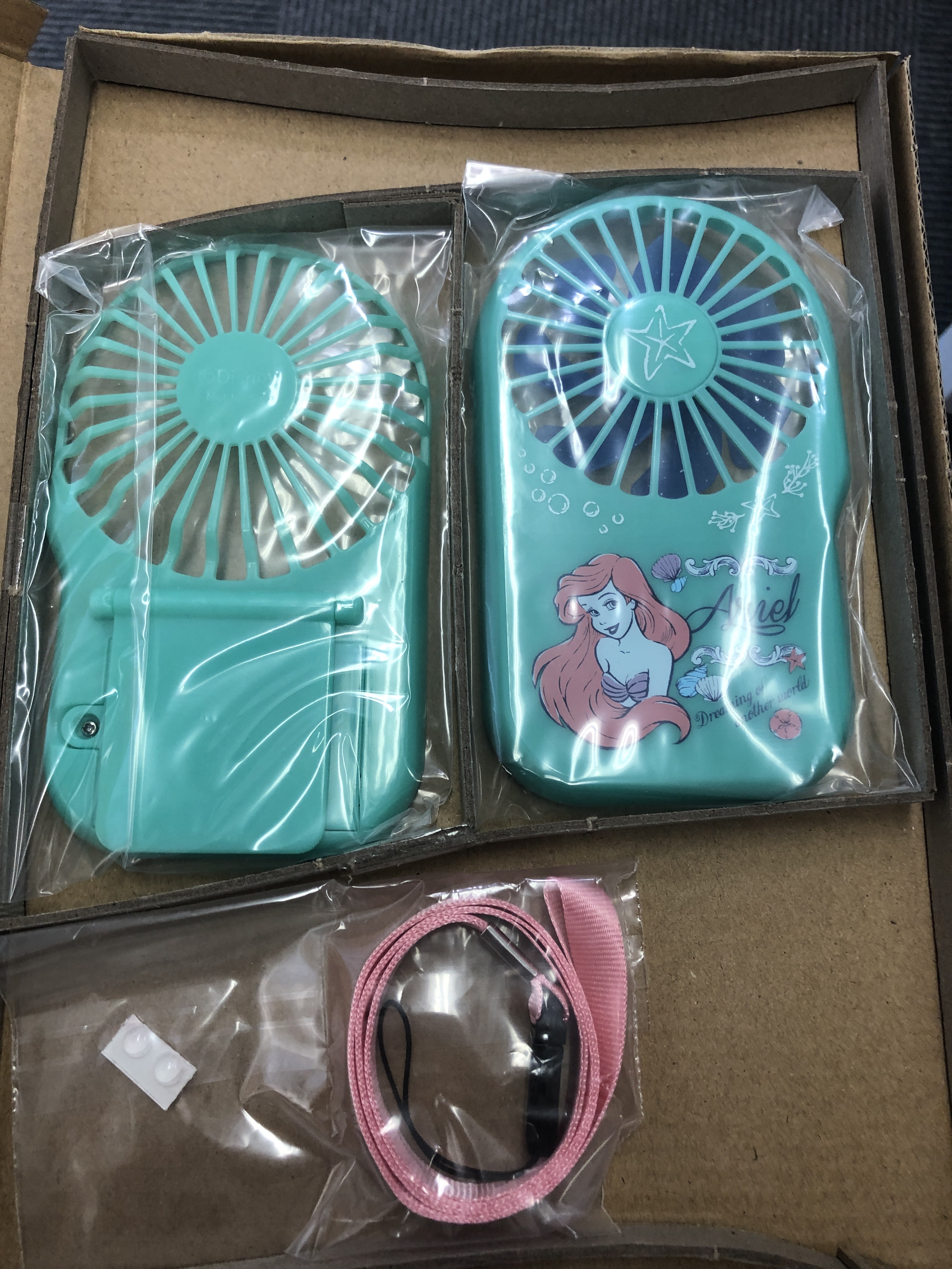 「アリエル キラキラ扇風機」はストラップホールとネックストラップ付き