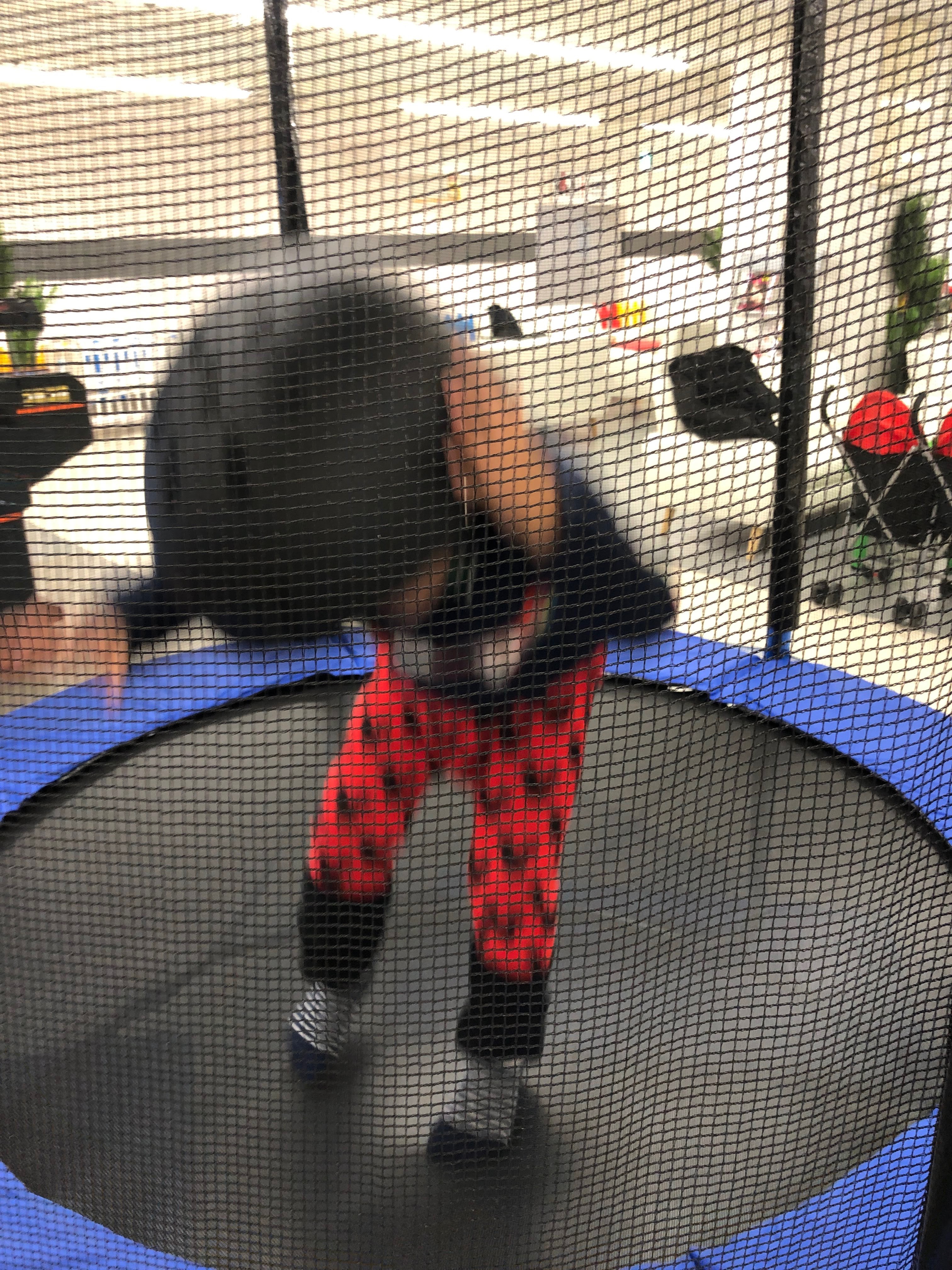 本格トランポリンが2ヶ所に設置されています。1人ずつ遊ぶシステムです。小さい子はヘルメット着用しないといけなくて、うちの子は飛んでそれがズレるのが気になる用であまり遊びませんでした。