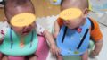 寝起きは機嫌が最悪なので泣くかな?と思いましたが泣かずに機嫌悪くブスっと座ってるパターンでした。対戦相手のお母さんのおもちゃに視線だけ動かすものの寝起きでピクリとも動かない次男。相手の女の子も動かず2人とも勝利!